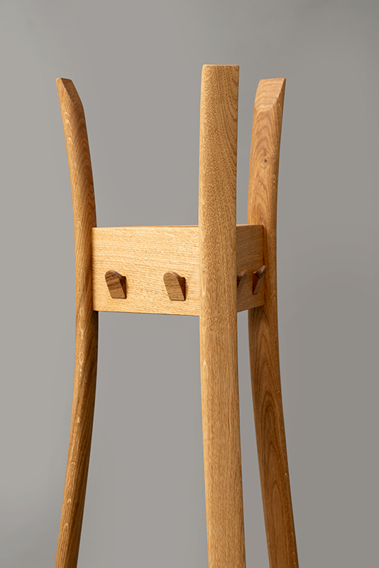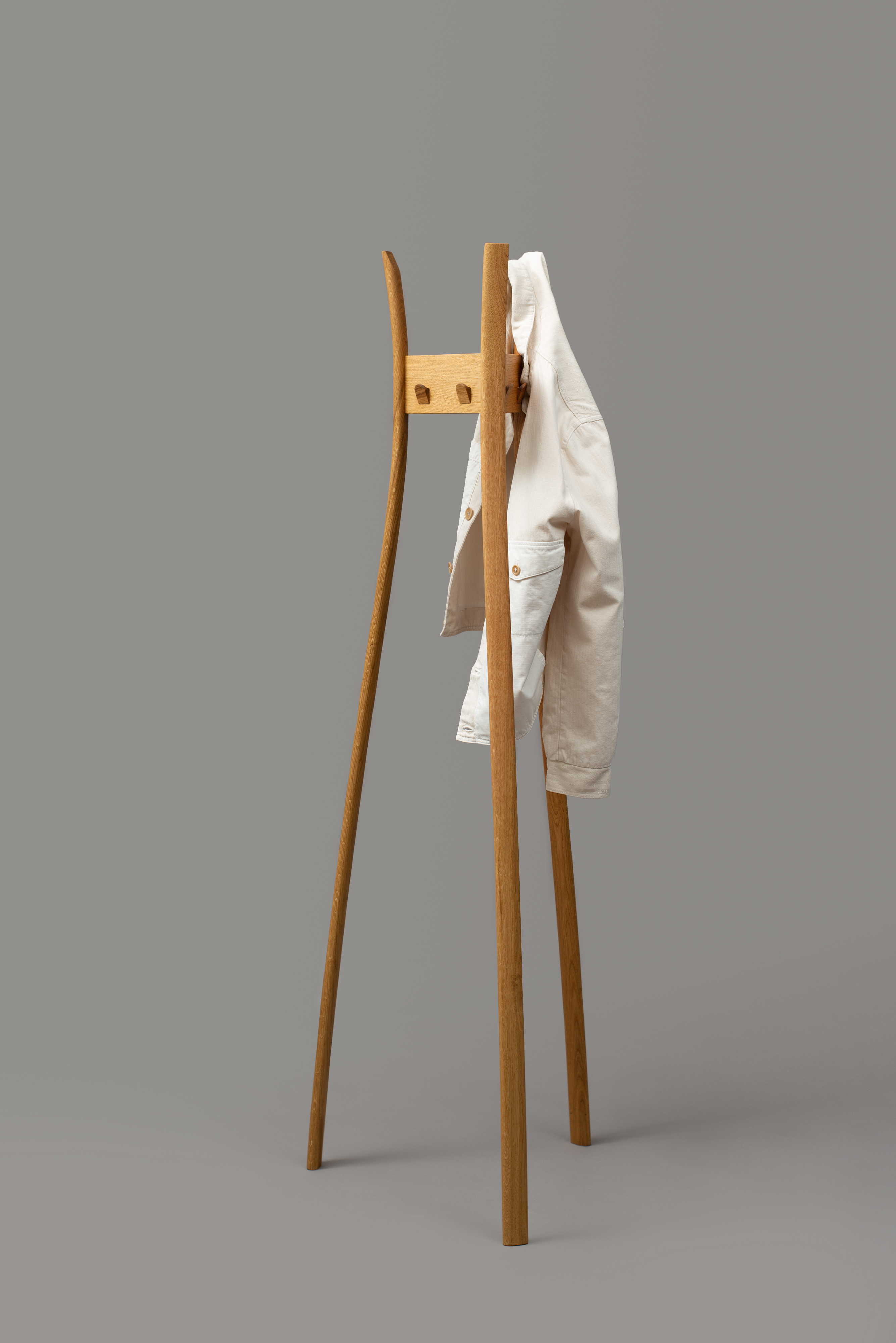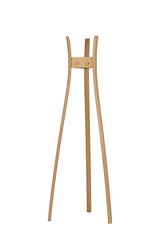 The coat stand AKI captures the essence of its furniture type. Its gently curved solid wood legs are connected at the top by a sleek triangle, featuring two wooden coat hooks on each side. AKI comes in naturally oiled walnut or oak, as well as open-pore black lacquer, combining the warmth of wood with contemporary look.