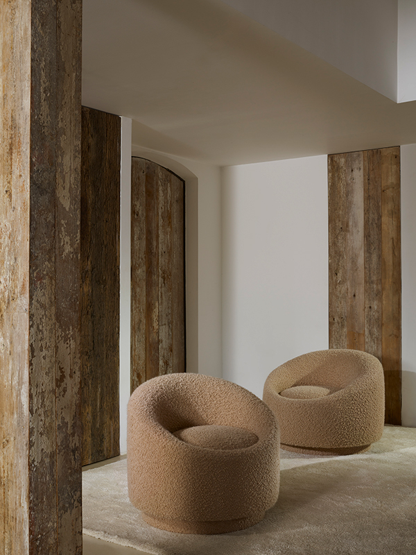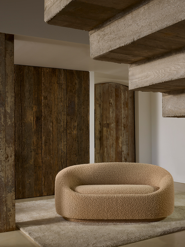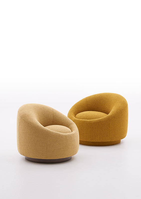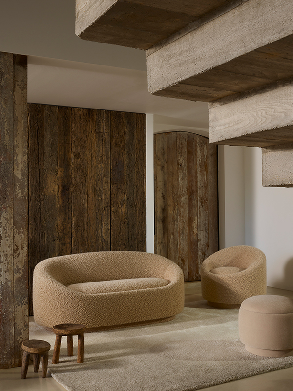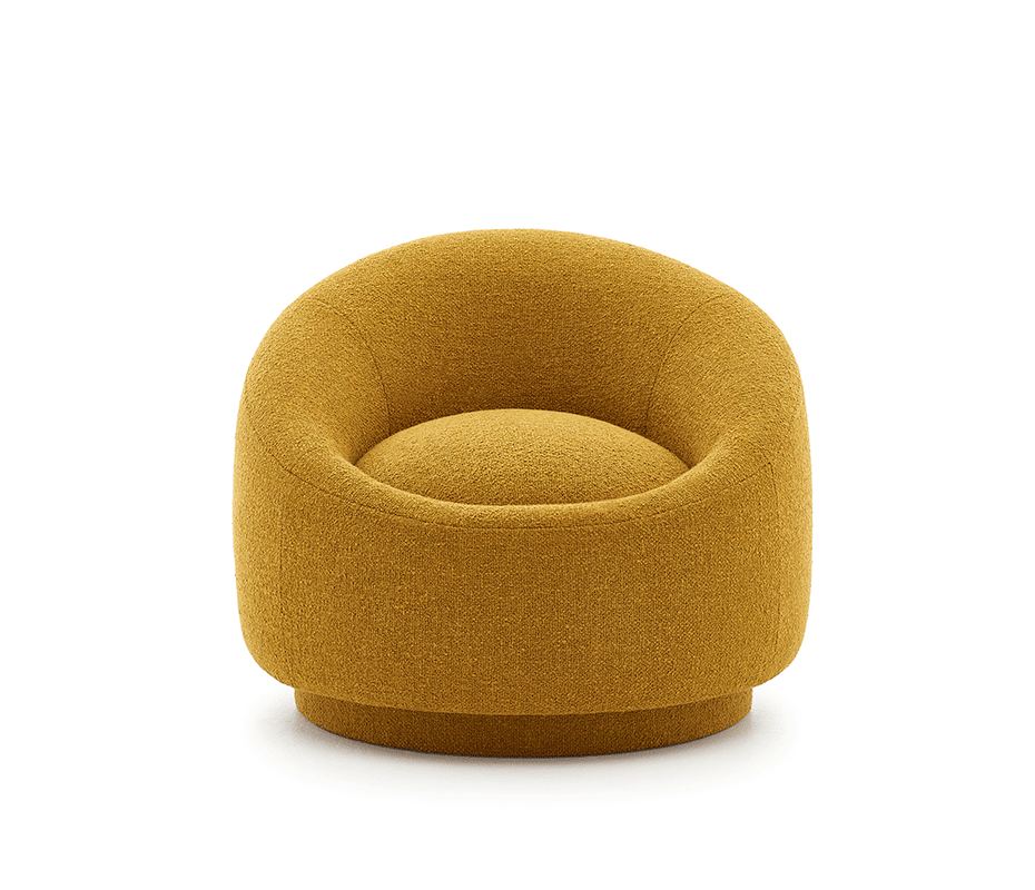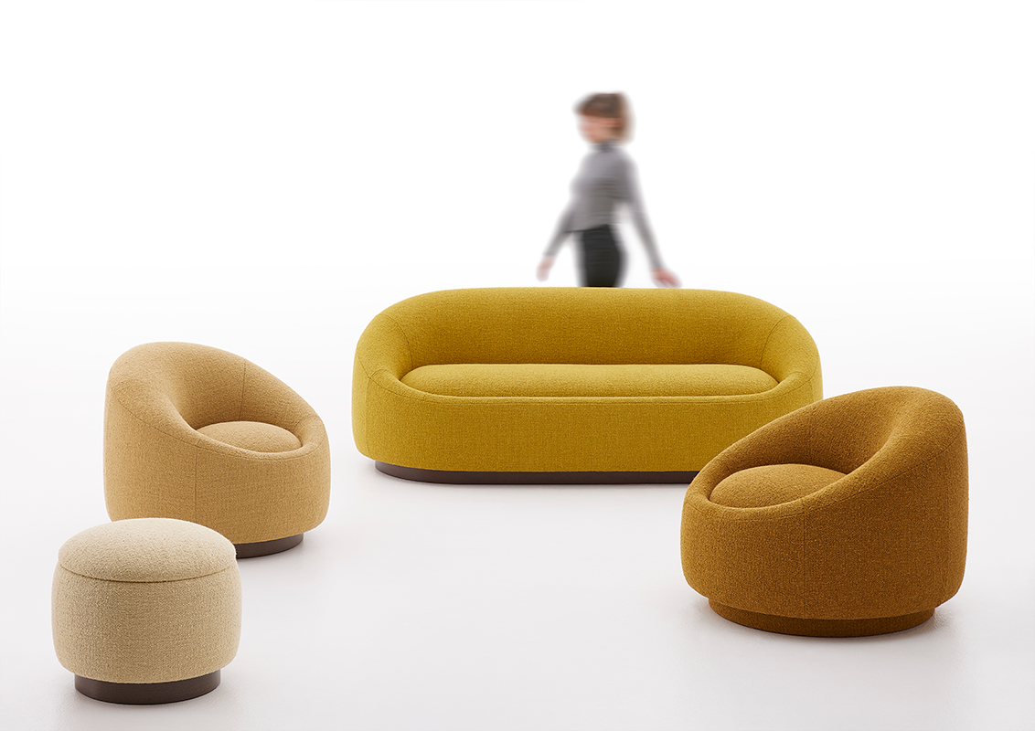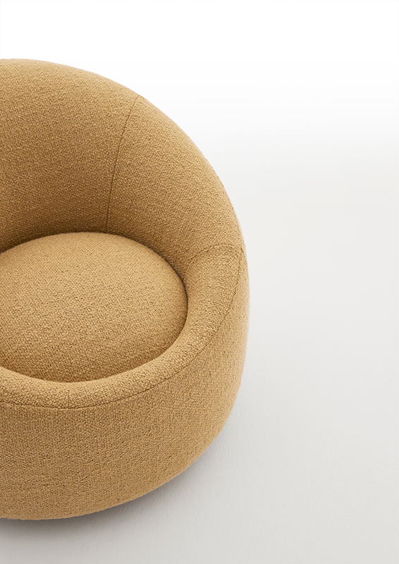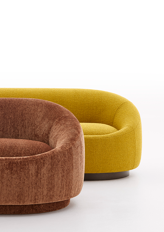 The design is based on an organic, rounded aesthetic vocabulary. The pure line of the backrest surrounds the seat in a continuous movement. The upholstered base gives a slight lift to the structure and creates a lightness to the pieces. Entirely upholstered, sofa, pouf and armchair are a tribute to the know-how of Maison Pierre Frey.