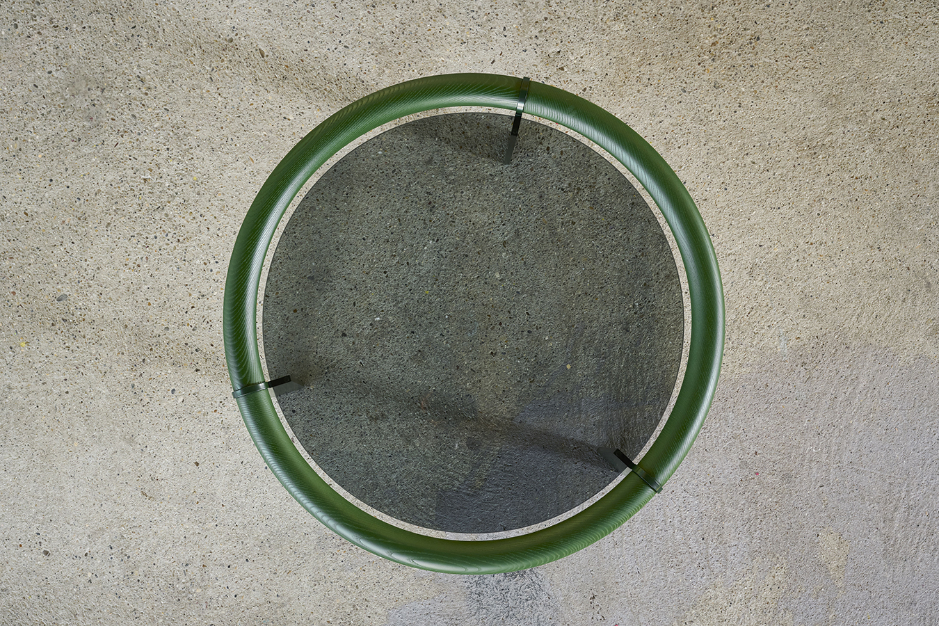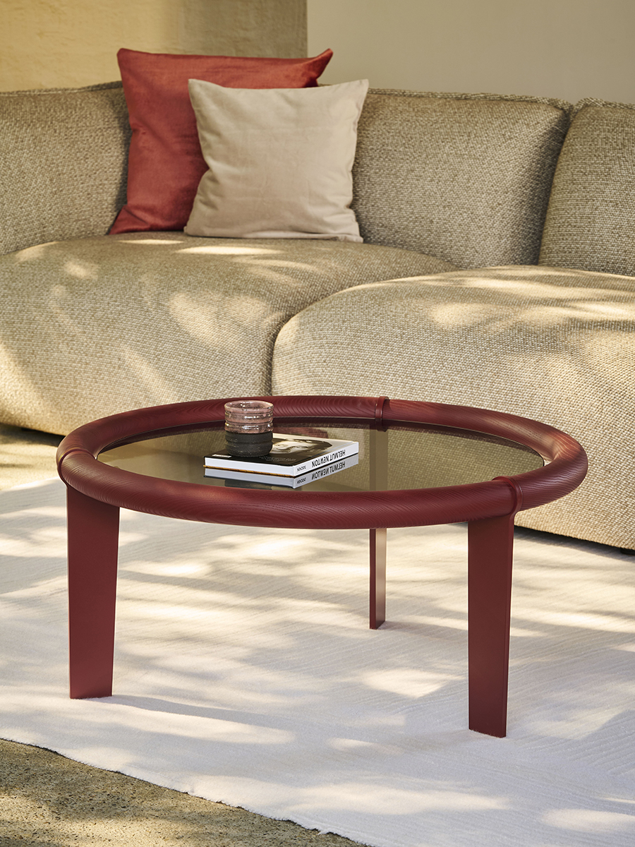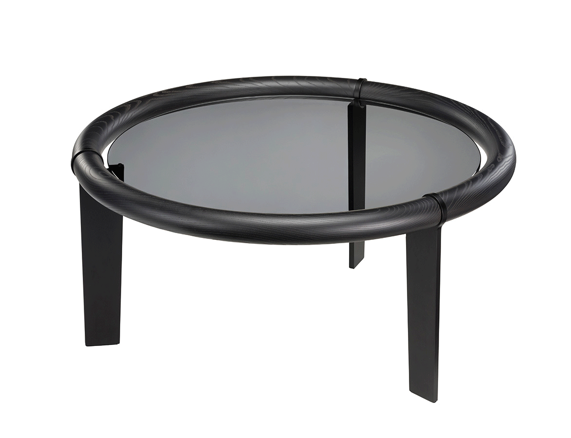 BOIA is a distinctive coffee table with a multi-faceted design and tactile contrasts. Its three curved segments are each meticulously handcrafted from solid ash, with an open-pored lacquer finish that emphasizes the natural grain, inviting touch to appreciate the material's beauty. Three metal legs, with a matte powder-coating in a matching color, pierce the wood to support the grey tempered glass top. The transparency of the glass unveils the legs.