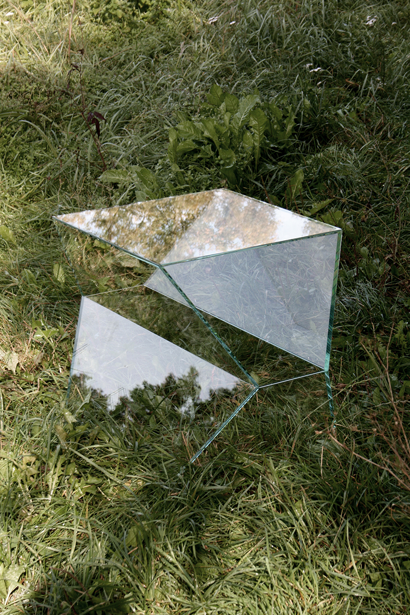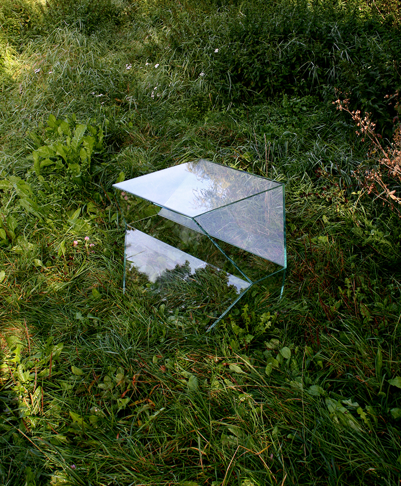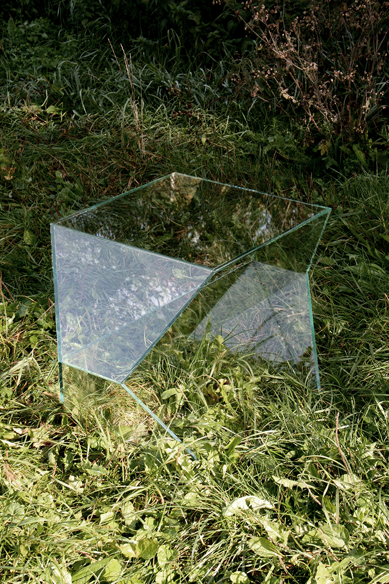From a craftsman point of view, this is an almost impossible task: Every single glass panel has to be mitre-cut in different angles and carefully assembled. The side tables COMPRESSED AIR have a ghost-like, pure appearance, communicating with their surrounding by reflection and transparency. The volume itself gets nearly dematerialized, what remains is its significant contour.