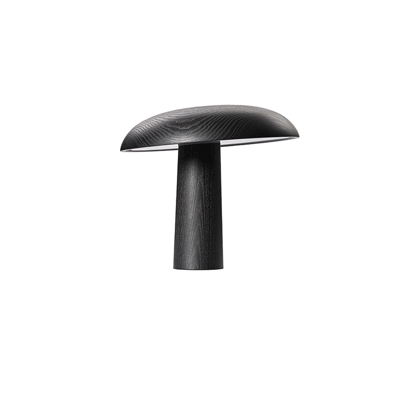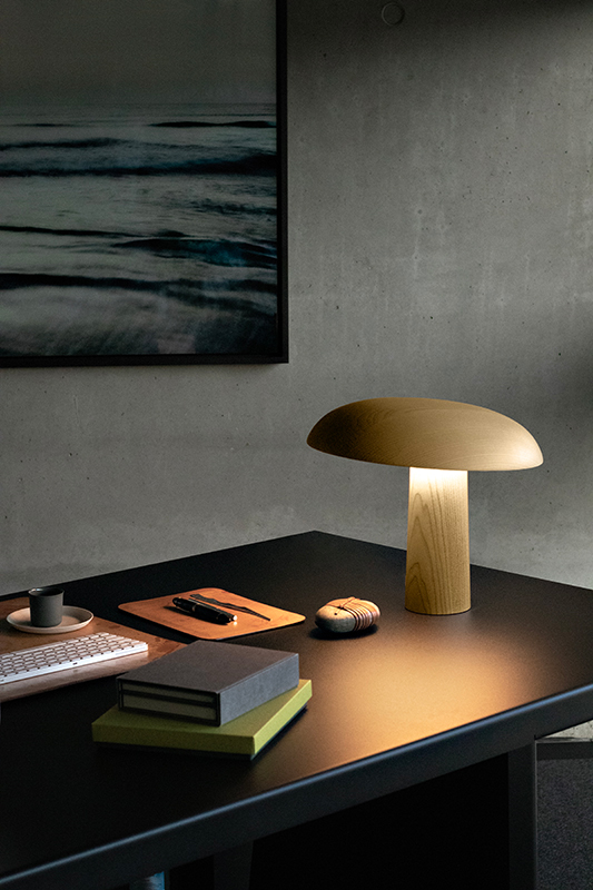 With FORMA, the essence of the 1940s/50s desk lamp is translated into solid wood, emphasizing minimalism and creating a distinctive silhouette. The asymmetrical base and the curved lampshade, crafted from solid wood strips, convey an organic, natural feel. The warm and sensual aura of the ash or walnut wood used in Forma gives the lamp its inviting character. An inconspicuous embedded push button in the base ensures easy operation, while the large, slightly inclined shade with a satin-finished diffuser and dimmable warm-white LED ring provides glare-free, pleasant light. Forma is versatile, making a statement on the desk, sideboard, console, or bedside table.