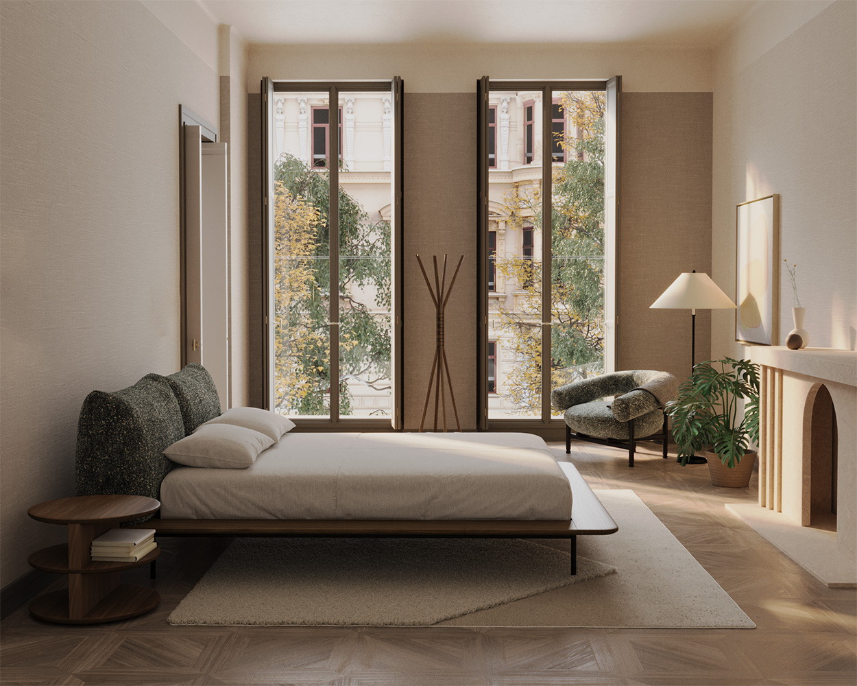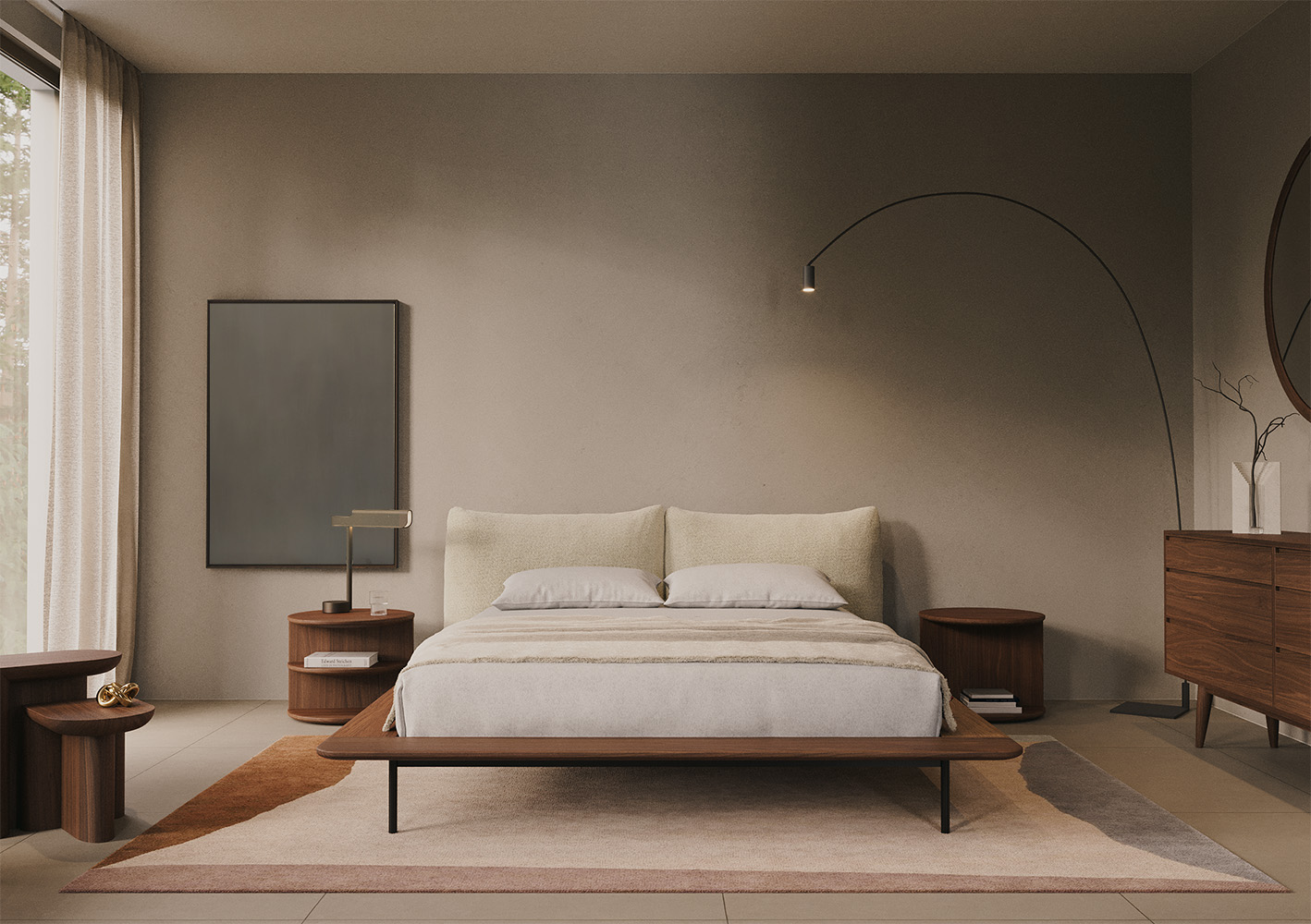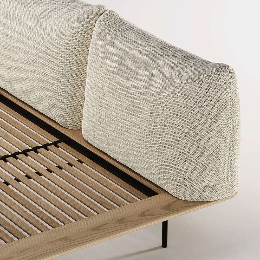 The Platform bed is features a solid wood frame with a slender profile, supported by discreet metallic legs. Upholstered back cushions not only offer a comfortable embrace but also double as a backrest and headboard.