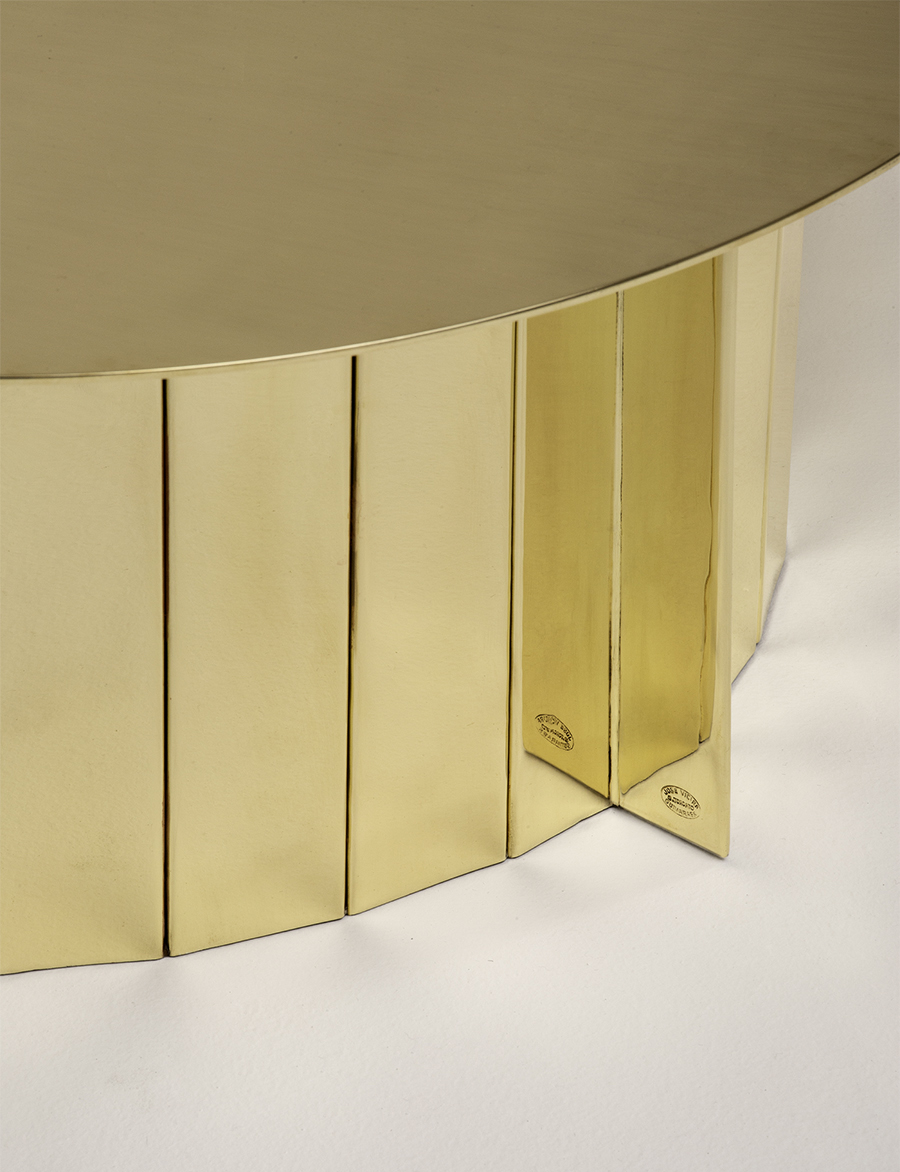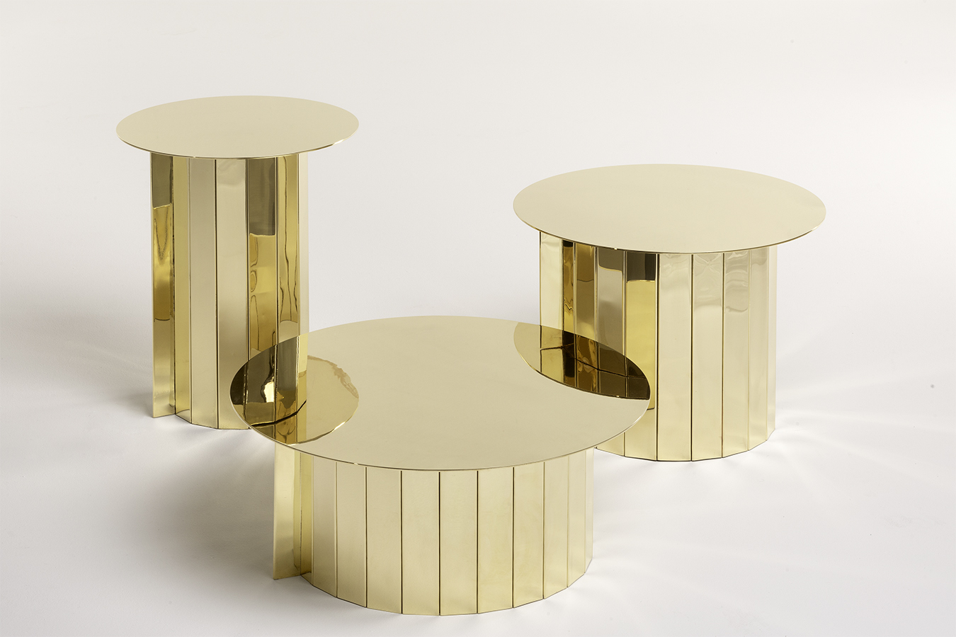 Though following in the footsteps of his ancestors, José has developed a more modern production of goods for daily use, with a focus on shape and functionality. This project goes in this direction. The three tables called PLEAT, all in polished brass, demanded exceptional mastery of bending and welding.