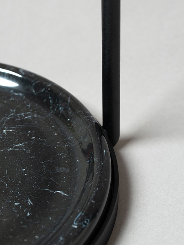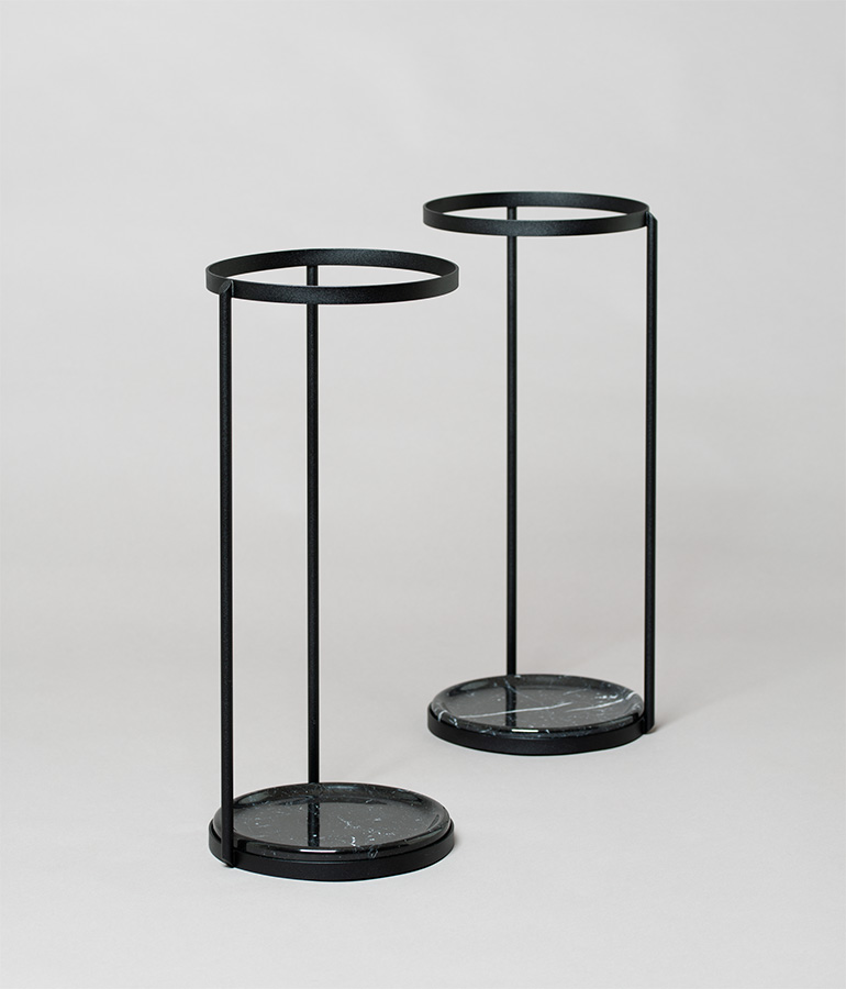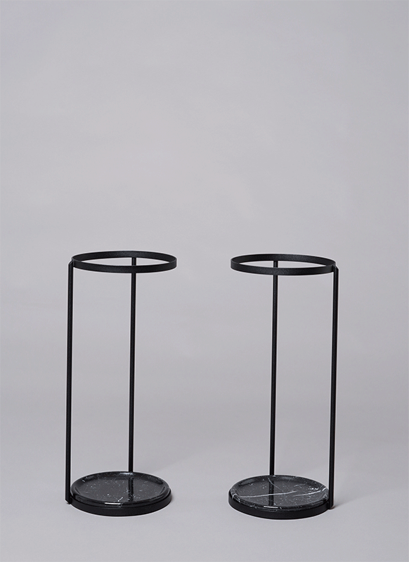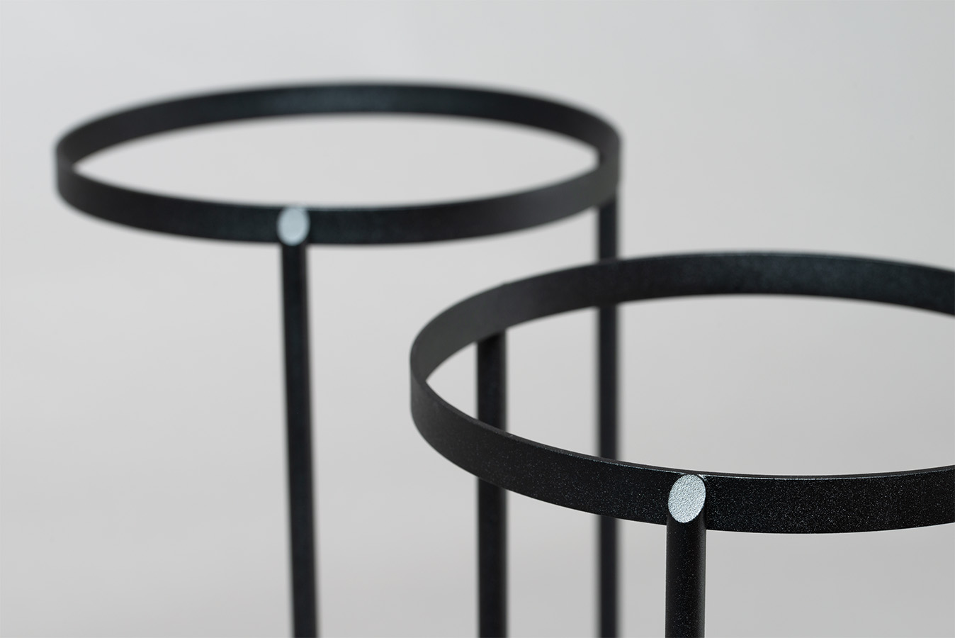 Powder-coated in black, the slender metal stand consists of two rings made of flat steel and two cylindrical vertical supports.