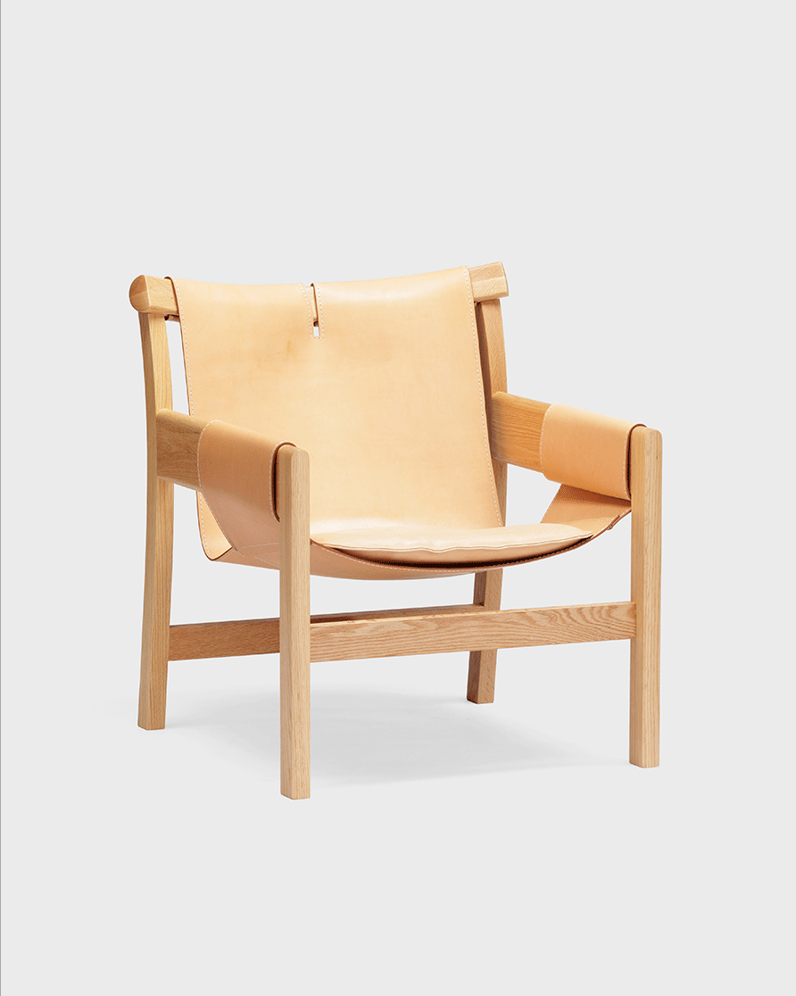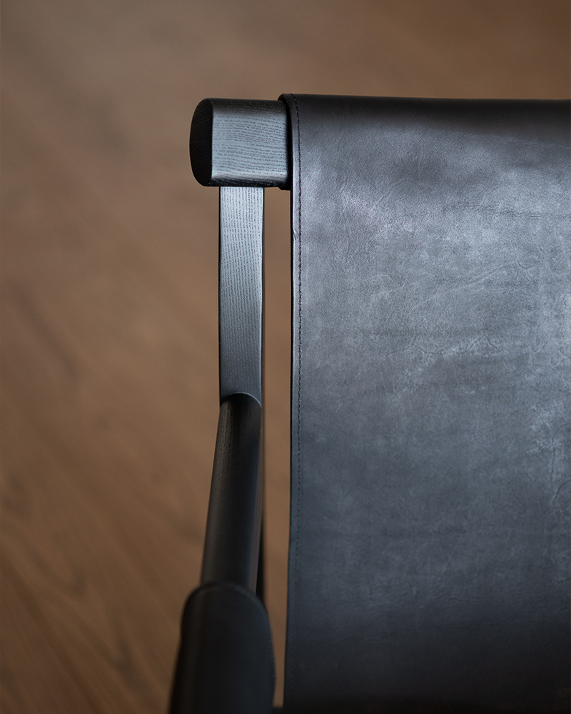 It is designed for durability, reinterpreting the traditional sling chair with modern structural design and detailed leather craftsmanship. The contemporary chair offers comfort for casual lounging, featuring a solid wood frame, an upholstered fabric seat, and a Japanese saddle leather sling that patinates beautifully to conform to the user’s body.